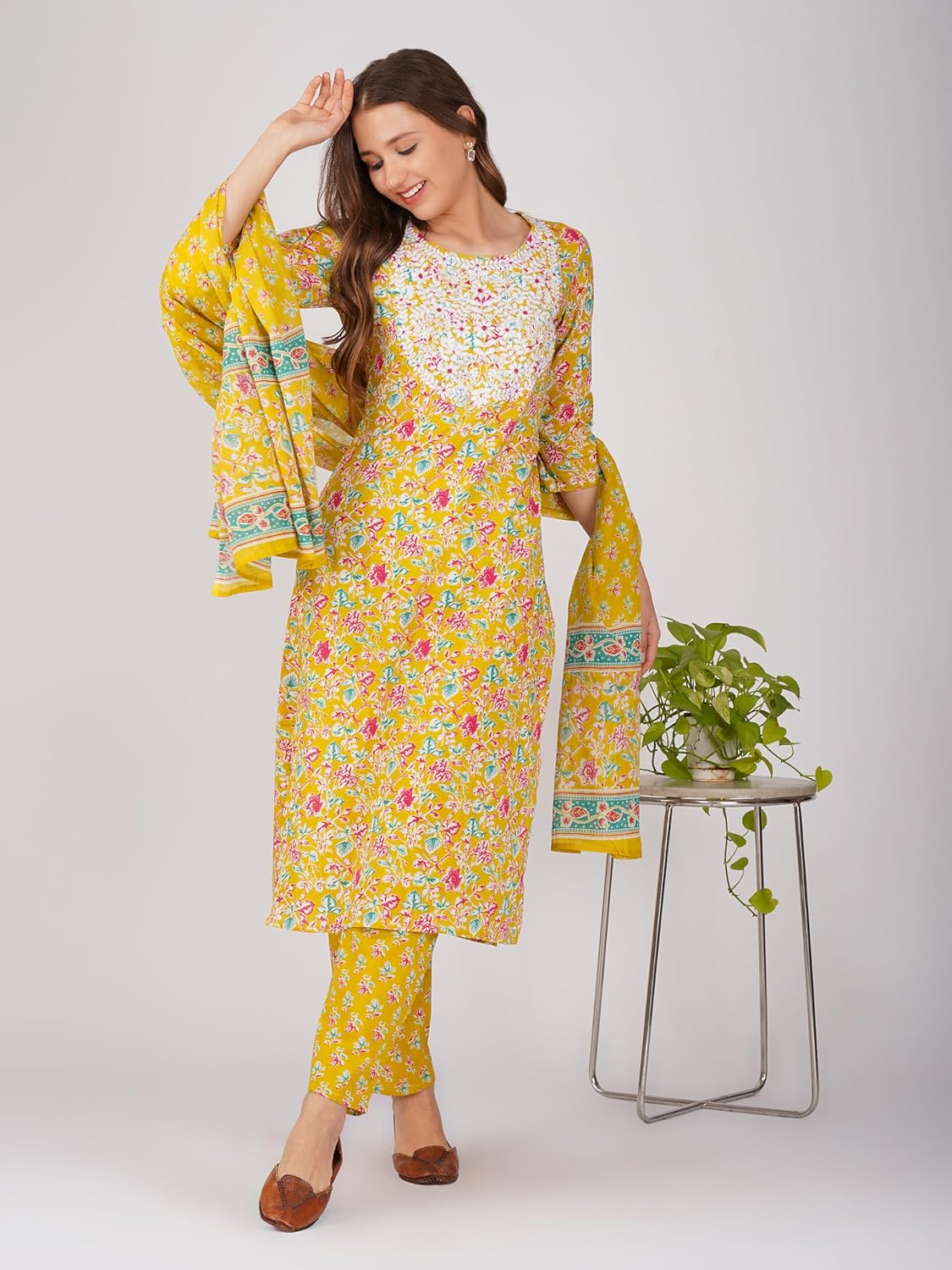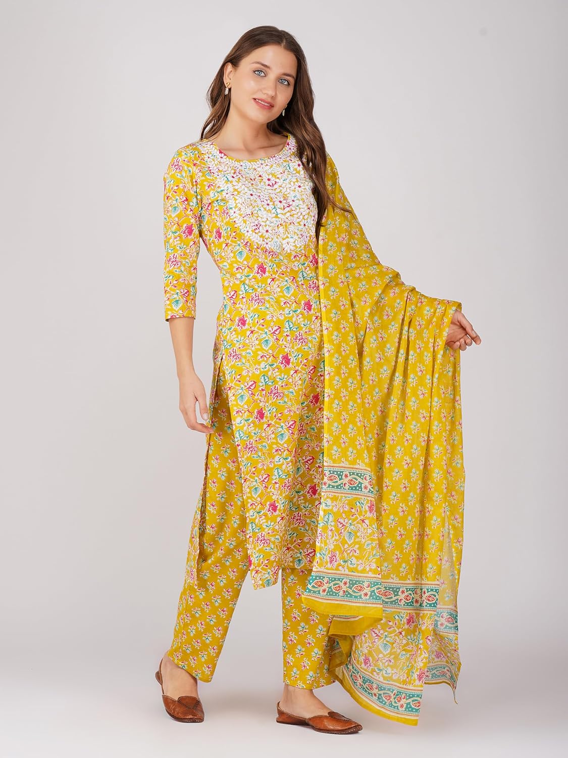 Amayra Women’s Cotton Embroidered Straight Kurta with Pant and Dupatta Set