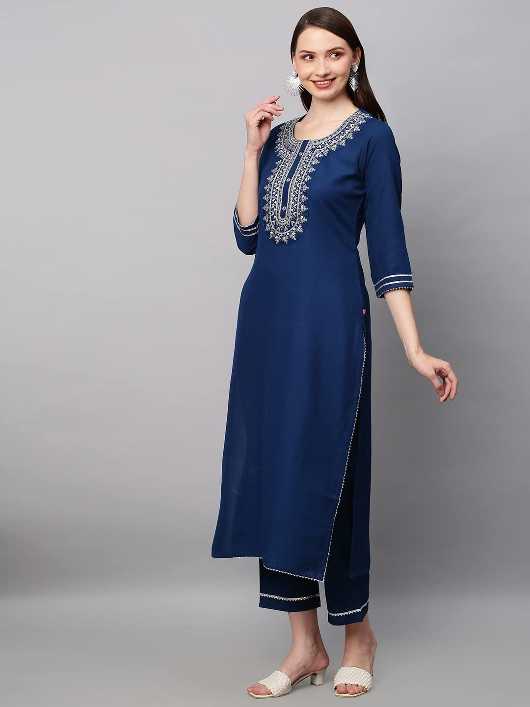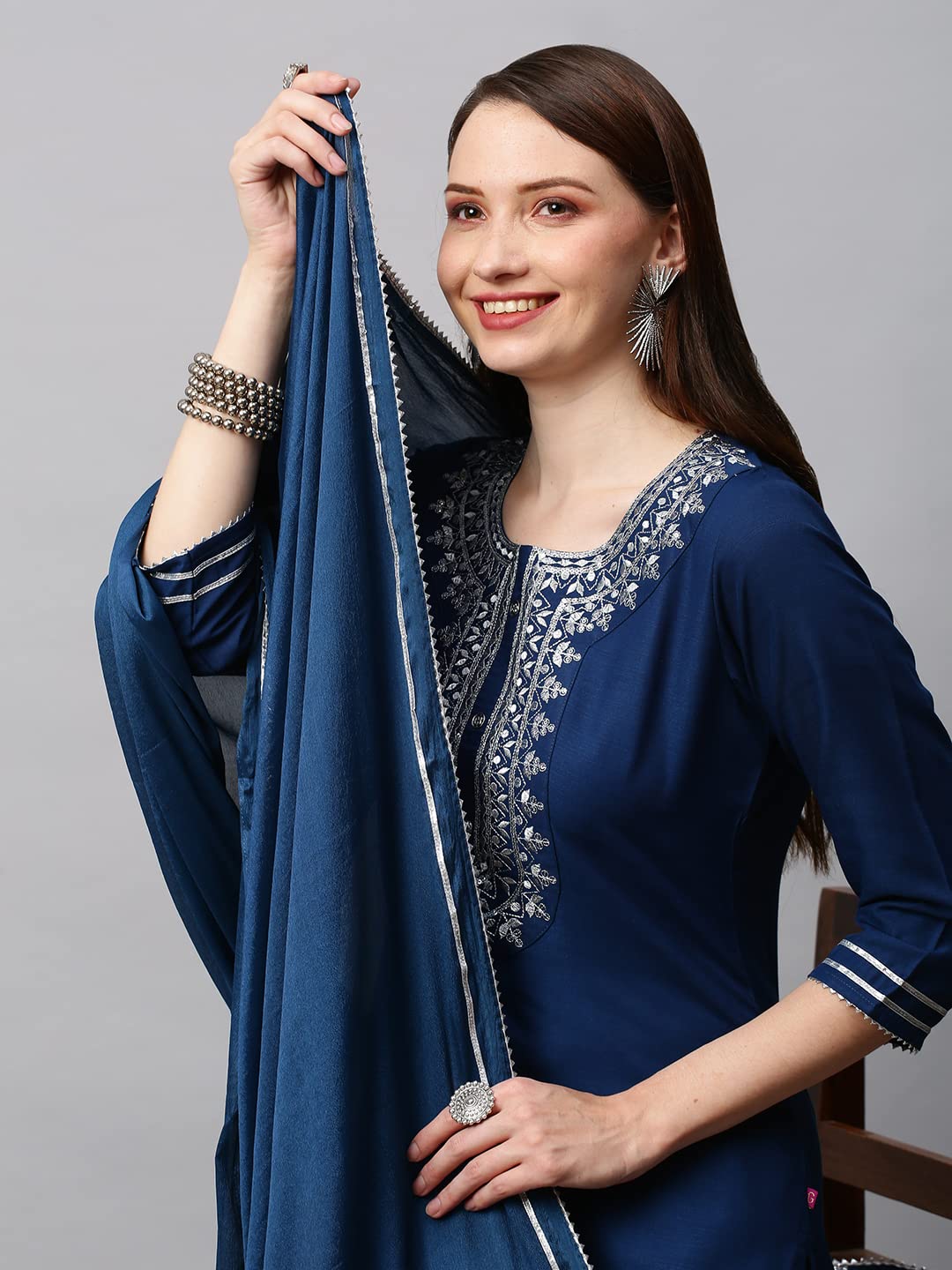 GoSriKi Women’s Cotton Blend Straight Embroidered Kurta with Pant & Dupatta Set (Dhati-GS)