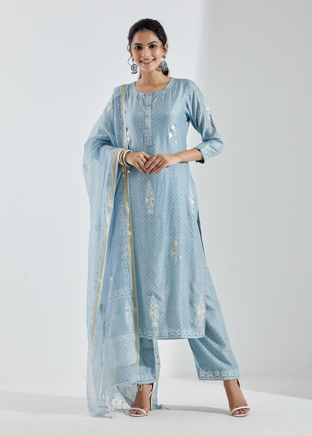 GoSriKi Women’s Cotton Blend Straight Printed Kurta with Pant & Dupatta