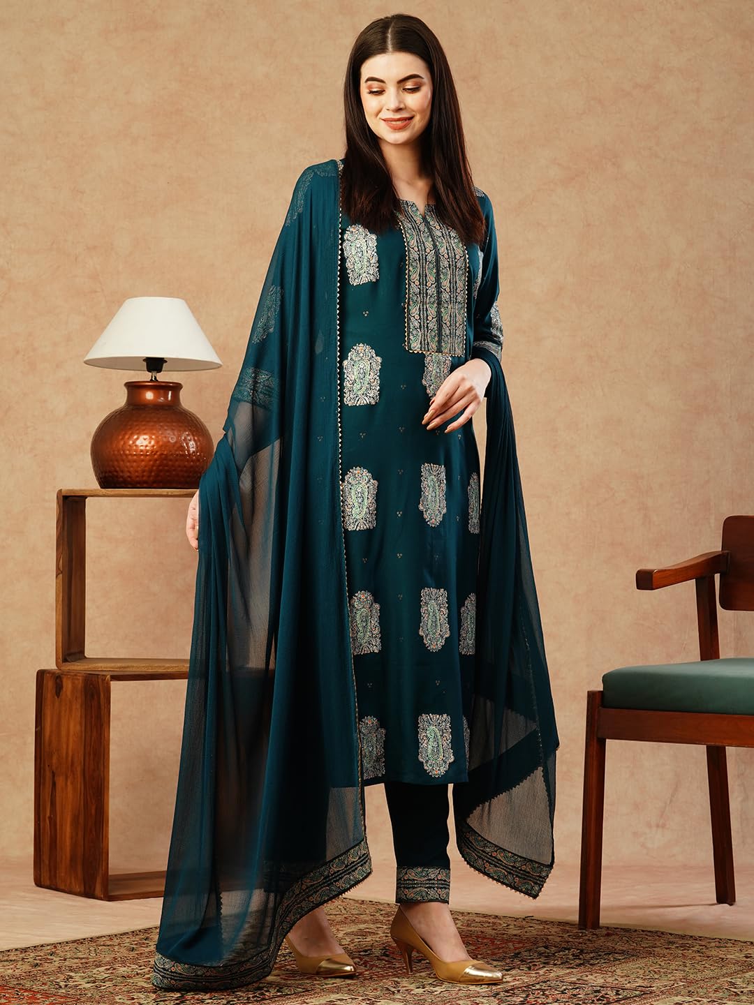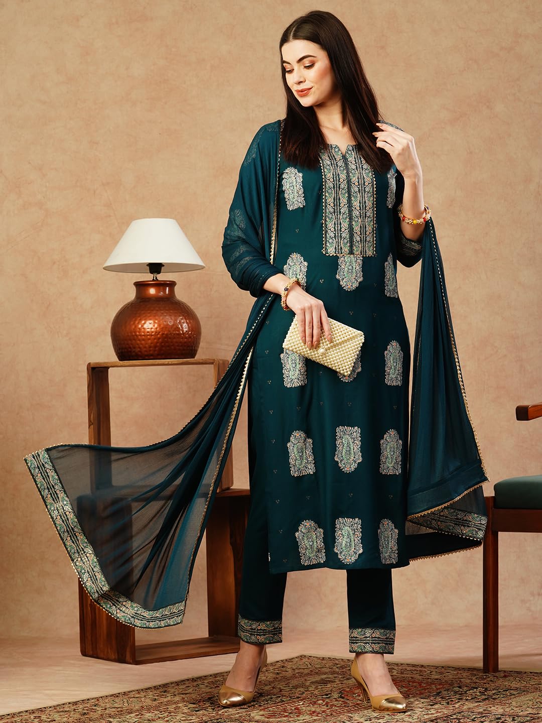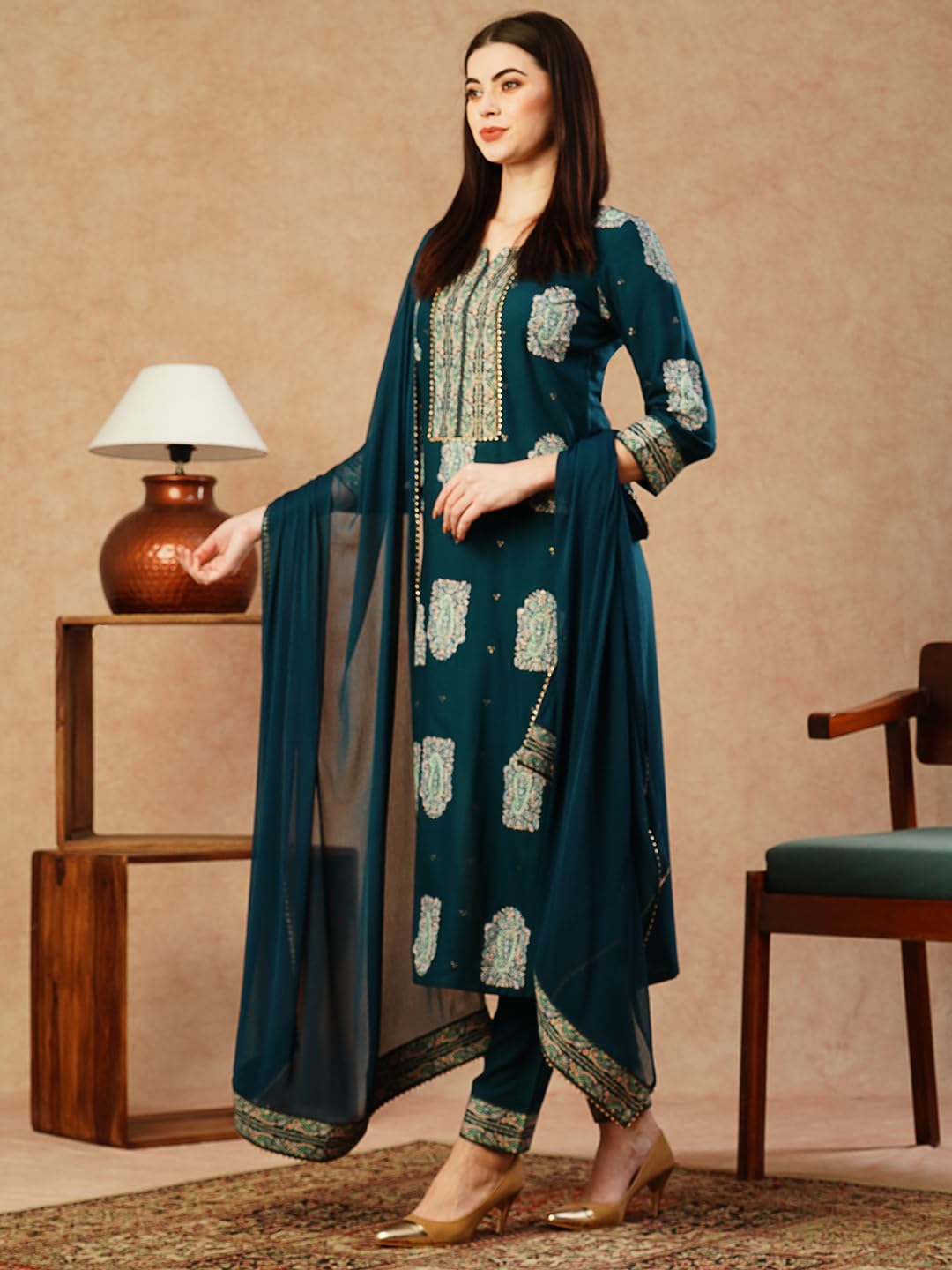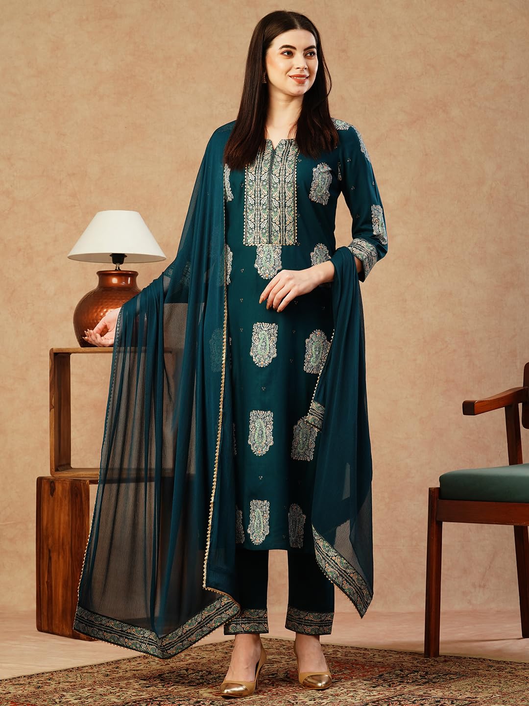 GoSriKi Women’s Cotton Blend Straight Printed Kurta with Pant & Dupatta