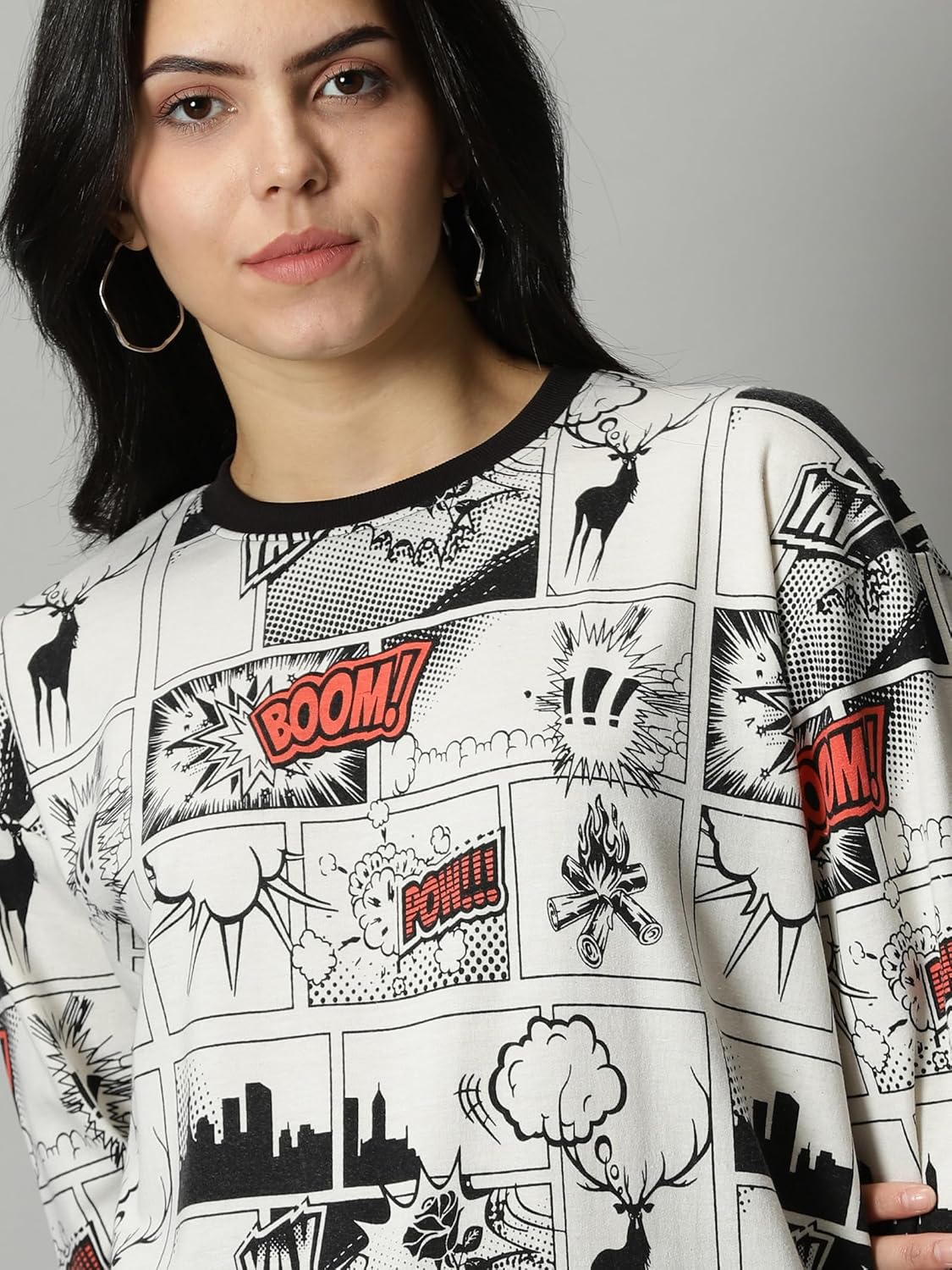 RodZen Oversized | Loose Fit |Full Sleeves Cotton Loopnet Round Neck Graphic Printed T-Shirt for Womens/Girls