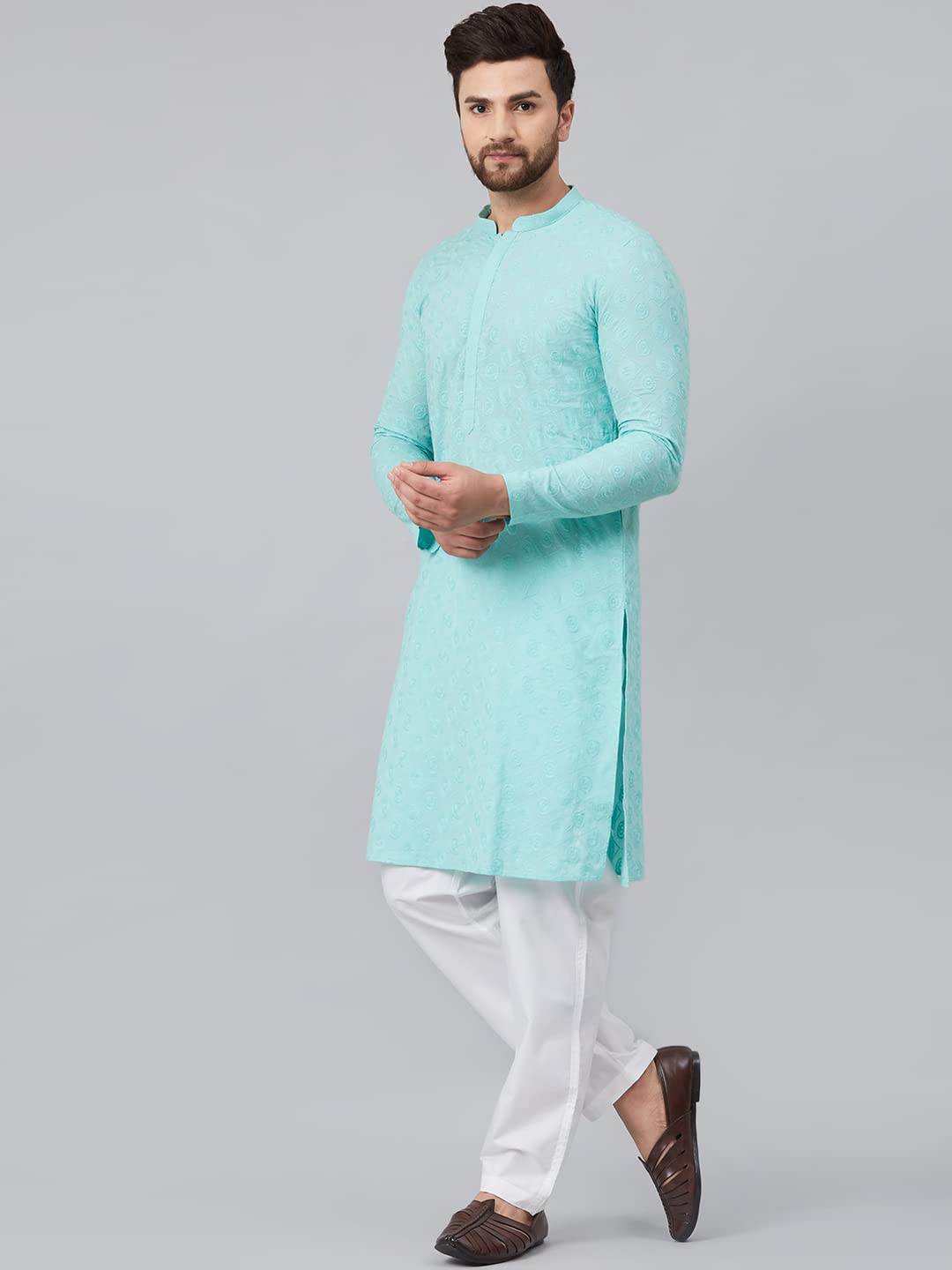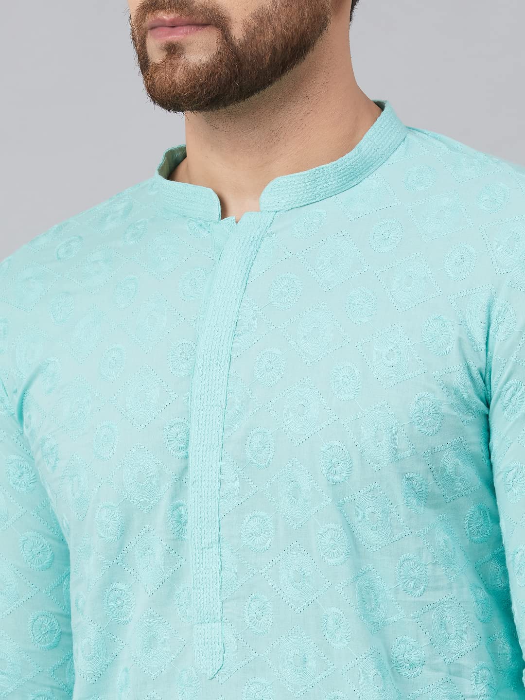Turquoise Blue chikankari embroidered straight kurta, has a mandarin collar, long sleeves, straight hem, side slits
