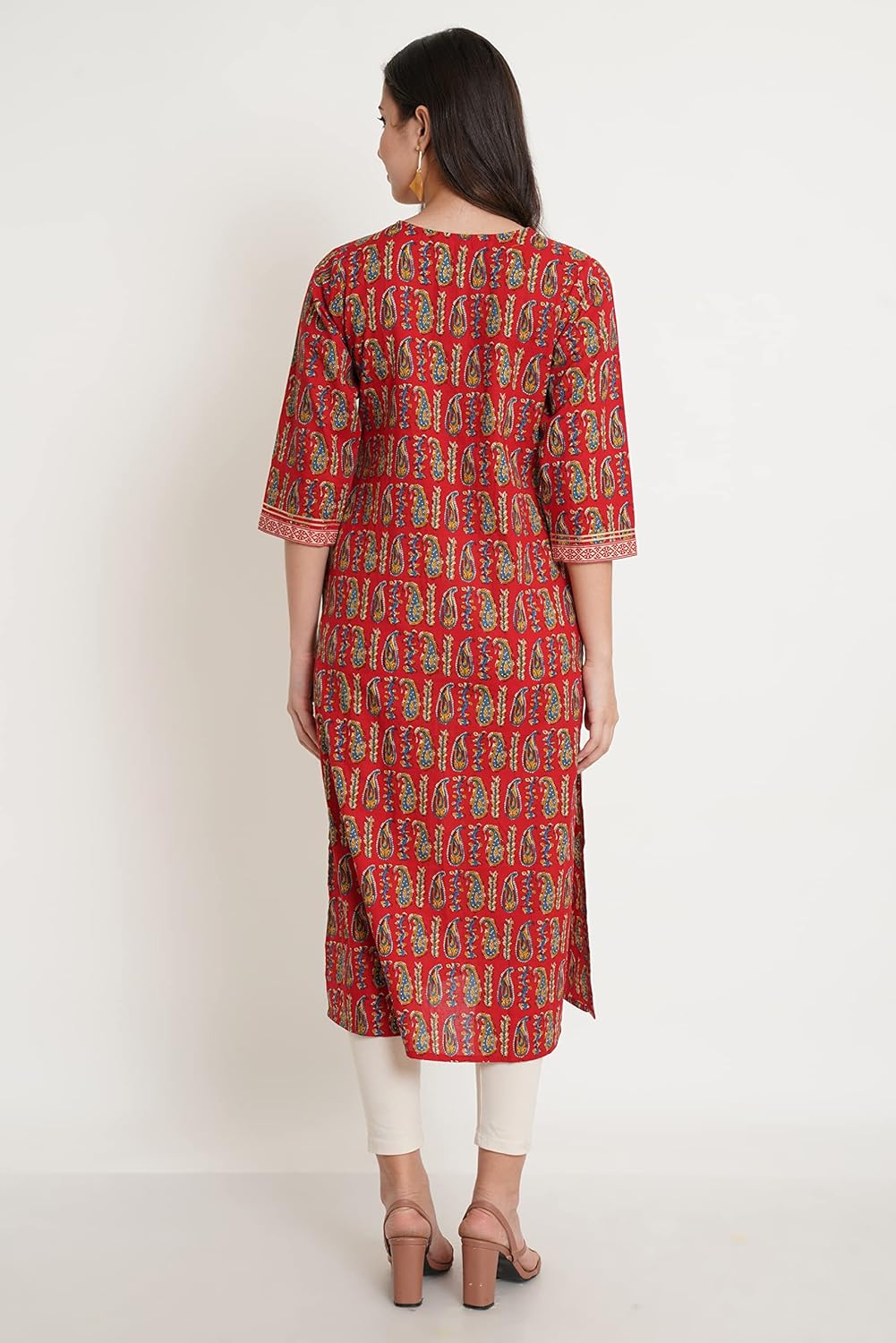 The Jaipuri Cotton Kurti Printed Straight Kurta for Women in Paisley Print is a beautiful, vibrant red kurta that is perfect for summers. It is made from famous Jaipuri Cotton, which is known for its smooth and comfortable texture, making it perfect for everyday wear. The kurta features a classic V-neck design that is flattering for all body types. The neckline is adorned with delicate lace and Gota work, which adds a touch of elegance and sophistication to the overall design. The kurta also has lace and Gota work on the sleeves and on the side slits, making it a truly unique and eye-catching piece. This kurta can be worn to a variety of occasions, from casual outings with friends to more formal events such as weddings or family gatherings. Its bold, bright color and intricate details make it a great choice for special occasions, while its comfortable fabric and easy-to-wear design make it perfect for everyday wear as well. To accessorize this kurta, you can opt for a pair of statement earrings in gold or silver to complement the Gota work on the kurta. A simple gold or silver bangle or bracelet would also work well to complete the look. For footwear, a pair of traditional juttis or sandals would be a great choice. When it comes to styling, you can wear this kurta with a pair of leggings, palazzos, or even jeans for a more casual look. If you’re going for a more formal look, you can pair it with a flowy skirt or a pair of wide-legged pants. Overall, the Jaipuri Cotton Kurti Printed Straight Kurta for Women in Paisley Print is a versatile and stylish piece that can be worn in a variety of settings. Its comfortable fabric, intricate details, and flattering design make it a great addition to any wardrobe.