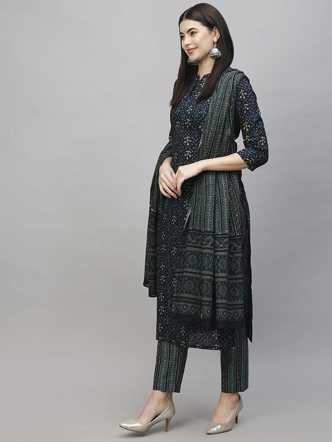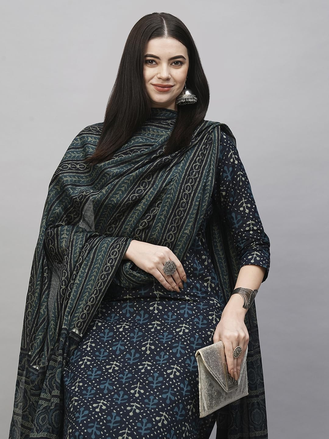 ANNI DESIGNER Women’s Cotton Blend Straight Printed Kurta with Pant & Dupatta (Vakula Green_M_Green_Medium)