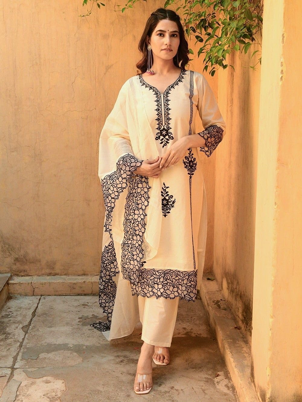 GoSriKi Women’s Cotton Blend Straight Embroidery Kurta with Pant & Dupatta