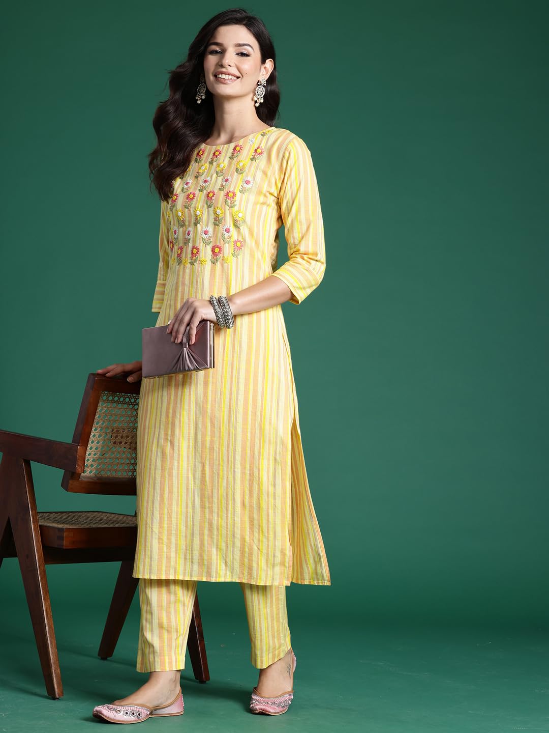 INDO ERA Women’s Pure Cotton Embroidered Straight Kurta & Pant Set (KS0MT6804)