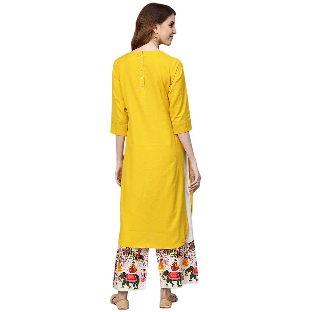 anubhutee Women’s Cotton Mustard Yellow Thread Work Ethnic Motifs Yoke Design Straight Kurta Suit Set With Palazzo