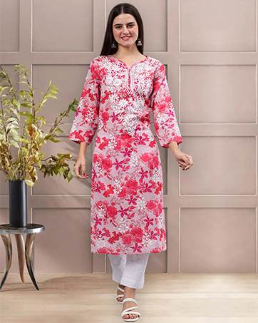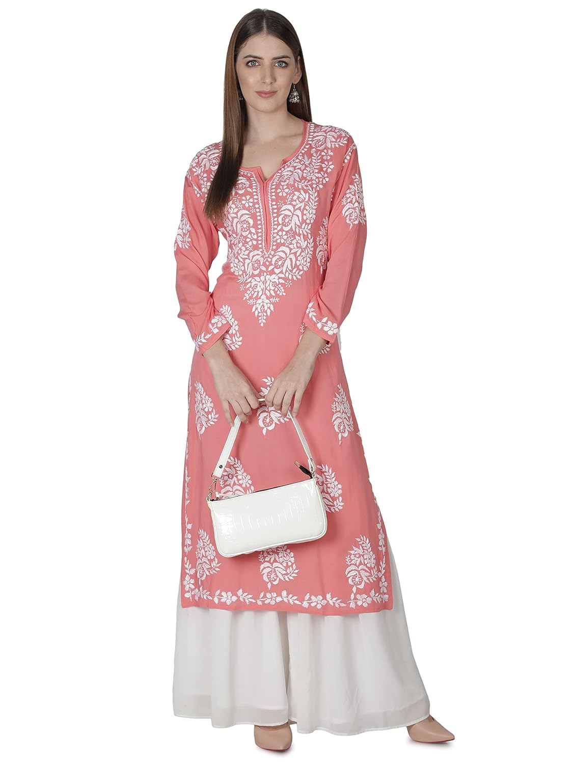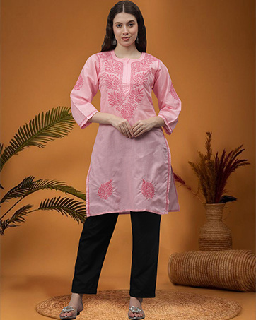 Seva Chikan Hand Embroidered Cotton Blend Lucknowi Straight Kurti Kurta SCL4006