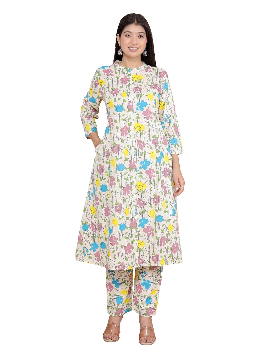 MeeraMe Online Women’s Cotton Floral Printed Mandarin Collar A-Line Kurti with Pant (Cream)