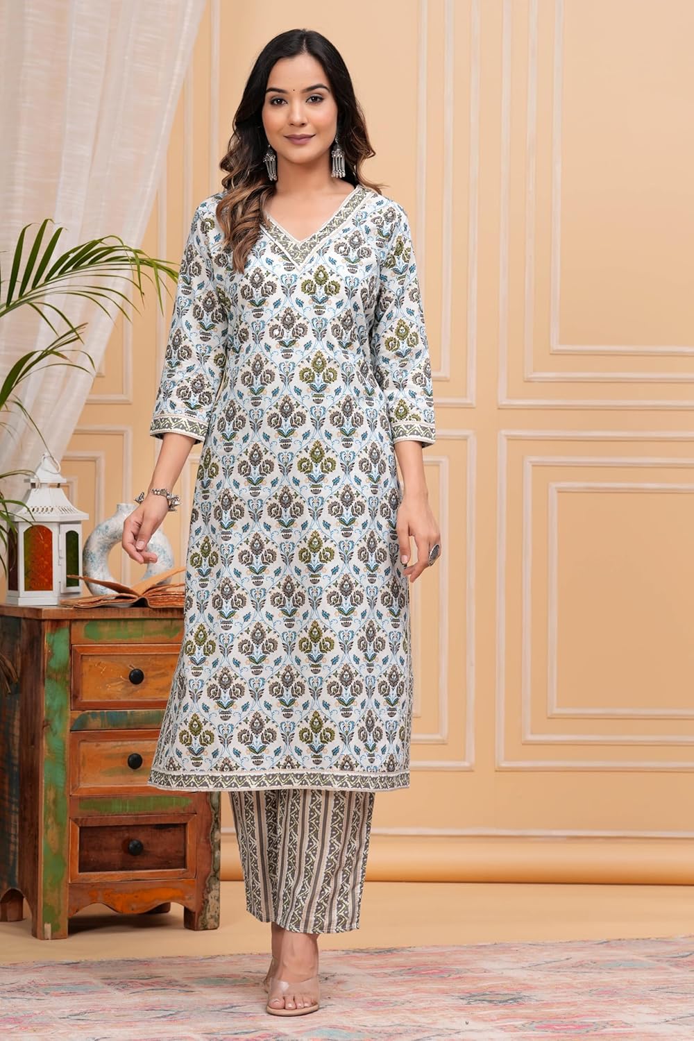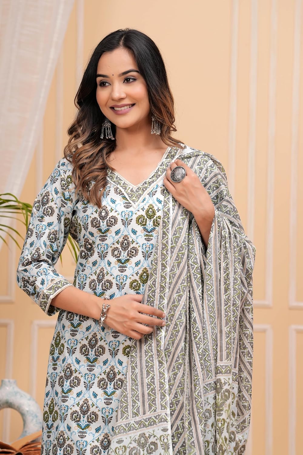 MANHAREE | Women’s Cotton Printed Straight Kurta with Pant & Malmal Dupatta Set